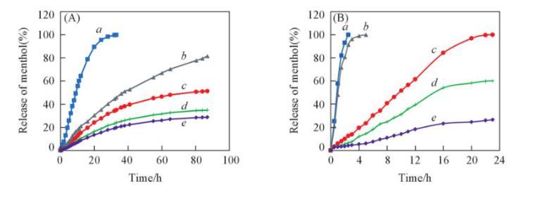 白家峰等采用聚多巴胺(PDA)修飾的介孔二氧化矽微球負載L-薄荷醇,發現PDA塗層有利於薄荷醇的可控緩慢釋放,在30℃空氣吹掃作用下,負載樣品中的薄荷醇在25 h後幾乎釋放完全;而在80℃空氣吹掃作用下,負載樣品中的薄荷醇在100 min後接近完全釋放。可見,本研究製得的負載體係具有較優的長效緩釋性能。