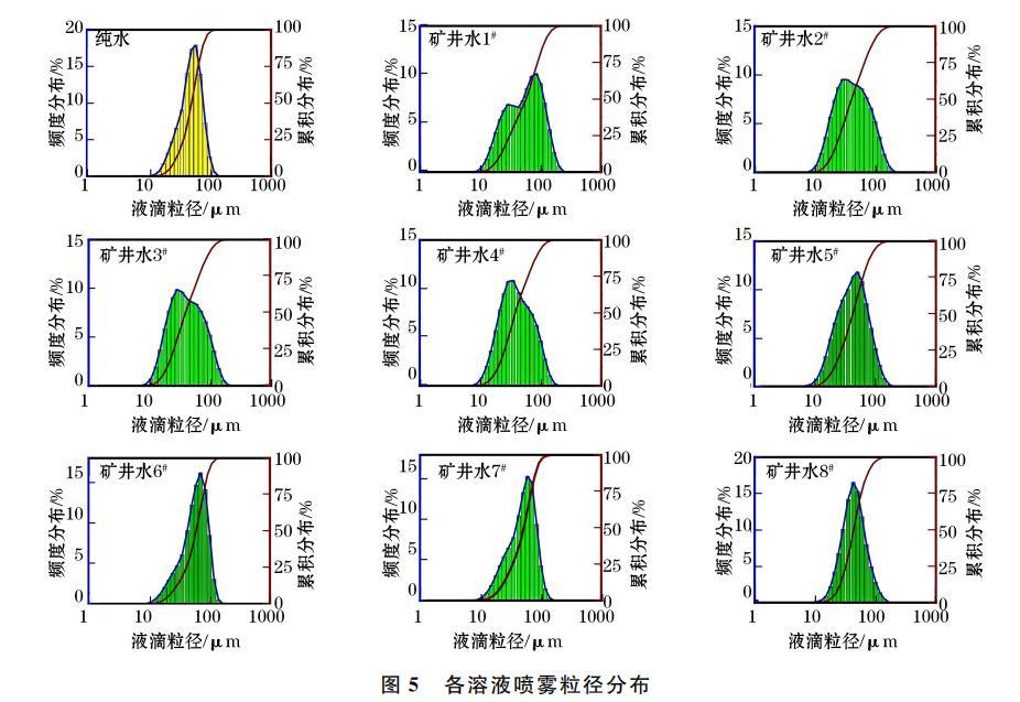 噴霧降塵效果與霧化特性參數密切相關,其中霧滴粒徑是影響霧化特性的關鍵因素。9組溶液在15cm測點處的粒徑分布如圖5所示。由圖5可知,各溶液霧滴粒徑主要分布為25~75μm,純水、礦井水1#至4#和礦井水5#至8#噴霧粒徑位於該區間的平均比例分別為80.10%、55.87%、69.73%,礦井水1至8#的粒徑累積分布曲線斜率逐漸增加,這說明礦井水霧化效果不斷提升。由此可知,礦井水中Na+、K+離子濃度越低,霧滴粒徑分布越集中,其霧場更有利於呼吸性粉塵捕集。這是由於礦井水表麵張力減小,霧滴破碎程度逐漸提高,致使霧滴細化且粒徑集中分布於25~75μm區間,這說明噴霧霧化特性隨表麵張力減小不斷優化,霧滴粒徑趨向均勻分布。綜上,礦井水中Na+、K+離子濃度差異改變其表麵張力,從而影響噴霧粒徑分布、霧化百分比等特性。