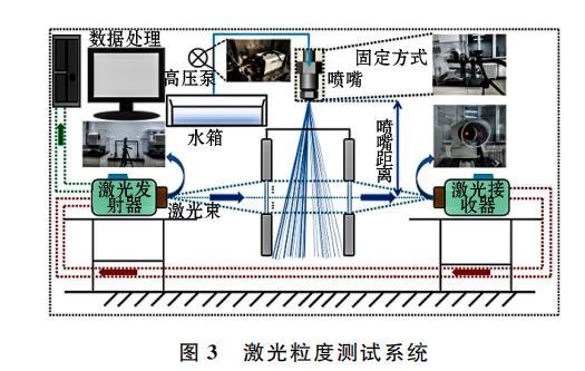 從圖3可知,噴霧粒徑測試主要儀器及工具包括激光粒度分析儀、高壓噴霧水泵、計算機分析控製係統等。計算機分析控製係統使用PAQXOS 4.1測量軟件,該軟件可定義、控製整個測量過程,並在試驗結束後處理測量的粒度分布數據。