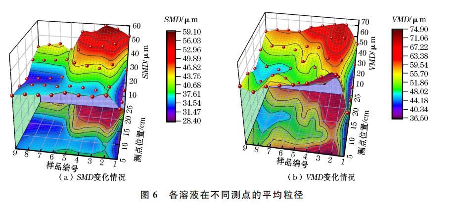 在噴霧形成過程中,空氣動力相同時,表麵張力對霧滴破碎的阻礙作用決定粒徑分布情況,所以表麵張力減小,溶液可分裂成無數尺寸細小的霧滴,其粒徑隨之細化。霧化是液體射出噴嘴後,受噴霧壓力作用不斷破碎呈霧滴的過程,因此礦井水表麵張力減小後,霧滴破碎受到的抑製力減弱,霧化過程適量延長,霧化區範圍隨之增大。隨著液體不斷分裂破碎,霧滴粒徑逐漸集中分布於某區間,各霧滴之間趨向均一化分布。