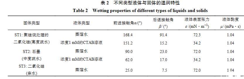 由於固、液兩相的表麵特性會顯著影響固−液接觸角,從而影響液滴與顆粒的碰撞行為,筆者通過實驗測量和文獻分析,對比了固、液特性的變化對接觸角的影響。表1列出了測量固、液特性時所使用的具體儀器及添加劑。表2給出了不同固體和液體樣品的接觸角、表麵張力和黏度。其中高度疏水固體ST1與不同液體接觸角通過實測得出,中度疏水固體ST2和親水固體ST3的測量數據來自ZHU等的研究。對比後發現,前進接觸角α明顯大於後退接觸角β,所以在分析塵−霧濕潤特性時應考慮前進角和後退角的差異。