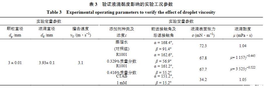 因此,碰撞速度v0設為3 m/s,液滴直徑dd設為4 mm。v0的大小通過液滴顆粒之間的豎直高度來設定,具體計算式為v0=√ ̄2gH,其中g為重力加速度,H為豎直高度,數值為40 cm。由於實驗誤差,v0測量值為3.1 m/s,dd測量值為3.93±0.1 mm。詳細的條件參數設置見表3。使用高速攝像機記錄樣品顆粒上剩餘的附著液體量。