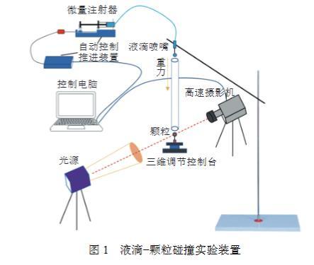 為確保每次實驗保持一致,實驗采用電自動微量注射器產生大小一致的實驗液滴,並通過調節不同高度的注射器來改變液滴−顆粒碰撞速度。為防止環境氣流對液滴軌跡的影響,在注射器下方設置了一個空心圓筒。在三軸光學平台上設置了樣品顆粒支座,利用EVA熱熔膠將樣品顆粒固定在支座的金屬支撐絲上。顆粒的位置可通過三軸光學平台進行調整。使用了Phantom VEO410L高速相機(Vision Research公司)對碰撞過程進行捕捉拍攝。相機和光源分別位於樣品顆粒的兩側。相機的拍攝頻率設定為2 000 fps,圖像分辨率為1280×800像素。