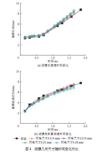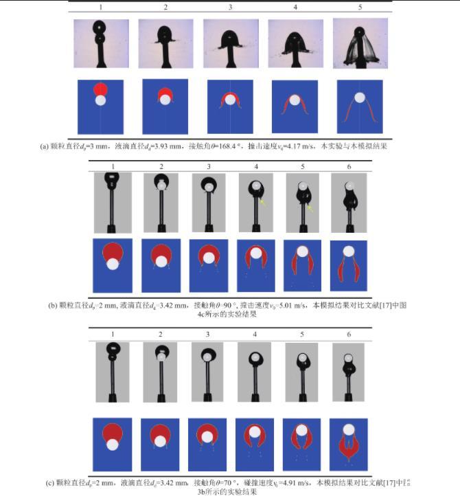 為了進行網格尺寸獨立性分析,在計算域尺寸為21 mm×66 mm時,將網格尺寸分別設置為0.06、0.03、0.018和0.014 mm。在實驗中的碰撞條件為顆粒直徑dp=3 mm,液滴直徑dd=3.93 mm,接觸角θ=168.4°,撞擊速度v0=4.17 m/s。在上述相同碰撞條件下,利用不同網格尺寸開展數值模擬,並測量不同時刻下液膜長度和液膜底部直徑的變化數據進行對比,如圖3所示。如圖4所示,隨著網格尺寸降低,數值模擬結果與實驗結果趨於重合。當21 mm×66 mm計算域的網格尺寸達到0.014 mm時,數值模擬結果與實驗結果之間的偏差低於5%,圖5a對比了網格尺寸為0.014 mm時模擬得出的液滴形態與實驗中拍攝的液滴形態,兩者具有較高的吻合度。故後續模擬中均按此比例生成計算域網格。