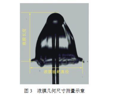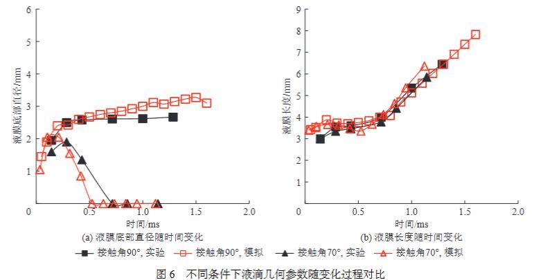 為進一步驗證本模型計算結果的可靠性,依據BANITABAEI等在實驗中設置的不同碰撞條件,開展了相應的數值模擬。如圖5b和圖5c所示,在不同碰撞條件下,數值模擬結果中的液滴形變過程與實驗結果均具有較高的吻合度。圖6對比了數值模擬結果與實驗結果中液滴幾何尺寸的變化過程,也具有較高的吻合度。其中,圖6a所展示的液膜底部直徑隨時間變化曲線,數值模擬結果與實驗結果稍有偏差,原因是實驗中固定顆粒的支撐柱對液膜底部的形變過程產生了一定影響。綜上所述,可認為筆者構建的數值模擬模型合理,結果具有較高可靠性。由於在毫米尺度下和微米尺度下,液滴與固體顆粒的碰撞過程均遵守經典牛頓力學定律和經典流體力學理論,所以本數值模擬模型可用於微米尺度下的其他工況條件的數值模擬研究。