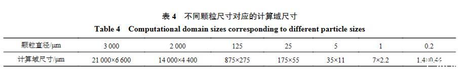 筆者為了將數值模擬結果與實驗結果進行對比驗證,在21 mm×66 mm的計算域內,設置了一個直徑為3 mm的顆粒,如圖2所示。筆者為研究不同尺寸樣本的碰撞行為,將根據顆粒大小對於數值模擬計算域相應的進行縮放。為便於模擬結果與前人的實驗結果進行對比,筆者將液滴−顆粒直徑比Ω均設定為1.31。詳細的各個顆粒尺寸下的計算域尺寸見表4。根據粉塵顆粒的尺寸對整個計算域進行等比例縮放,單元網格的幾何形狀、單元網格之間的關係以及網格質量都不會發生變化。因此計算域縮放前後不會造成模擬結果可靠度下降。