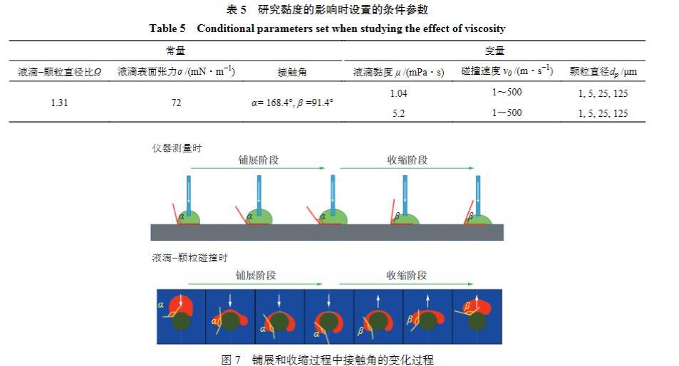 由於碰撞速度、粒徑和液滴黏度均會對液滴與顆粒的碰撞行為產生明顯影響,筆者針對這幾個因素設置了不同的數值模擬工況。具體工況參數見表5所示,其中液滴鋪展過程中的前進接觸角為α;液滴收縮過程中的後退接觸角為β。利用數值模擬軟件的自動保存功能,對碰撞行為發展過程中不同時刻的模擬數據進行了保存。如圖7所示,當液滴在顆粒表麵鋪展時,在迭代過程中將接觸角值設置為α。在液滴在顆粒表麵的鋪展過程轉變為收縮過程的時刻,將接觸角數值由α改為β,再進行後續的迭代計算。