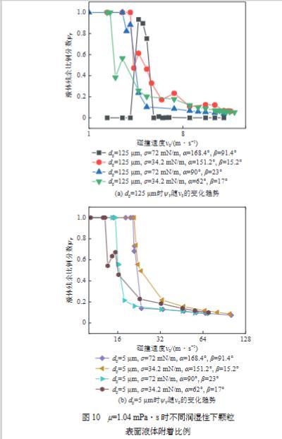 1)當粒徑大於25μm的霧滴與疏水粉塵以低於5 m/s的速度碰撞時,“反彈”現象發生的概率較大,塵粒表麵液體附著量接近0。對於塵、霧粒徑均不超過5μm的情況,“反彈”現象幾乎不會發生。因此,降低霧滴粒徑有利於提高塵粒表麵的液體附著量。