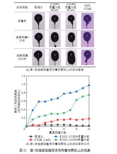 圖11a對比了液滴連續碰撞疏水顆粒前後顆粒表麵的液體附著狀態。由於在實驗中無法直接測量顆粒上附著液體的三維體積,因此筆者通過測量每次碰撞後基於二維實驗圖像的液滴麵積的變化來進行定量對比。圖11b對比了附著在顆粒上的測量的液體麵積比例隨碰撞次數增加而發生的變化。對比實驗結果可發現,當蒸餾水滴與高疏水性顆粒反複碰撞時,保留在顆粒上的液體麵積不超過5%。然而,當增稠劑被添加到水中時,在每次碰撞之後,附著在顆粒上的液體迅速增加。增稠劑濃度越高,附著在顆粒上麵的液體比例增長速度越快。相反,當CTAB加入水中時,附著液體比例的增長速度比蒸餾水略快,但比增稠劑溶液明顯更慢。這一結果表明,在提高疏水粉塵治理效果方麵,增加液滴黏度比降低液滴表麵張力更有效。此實驗結果與之前的數值模擬結果相符,因此調控水霧流變特性是進一步提升其降塵效果的新思路,有望突破水霧降塵率瓶頸。