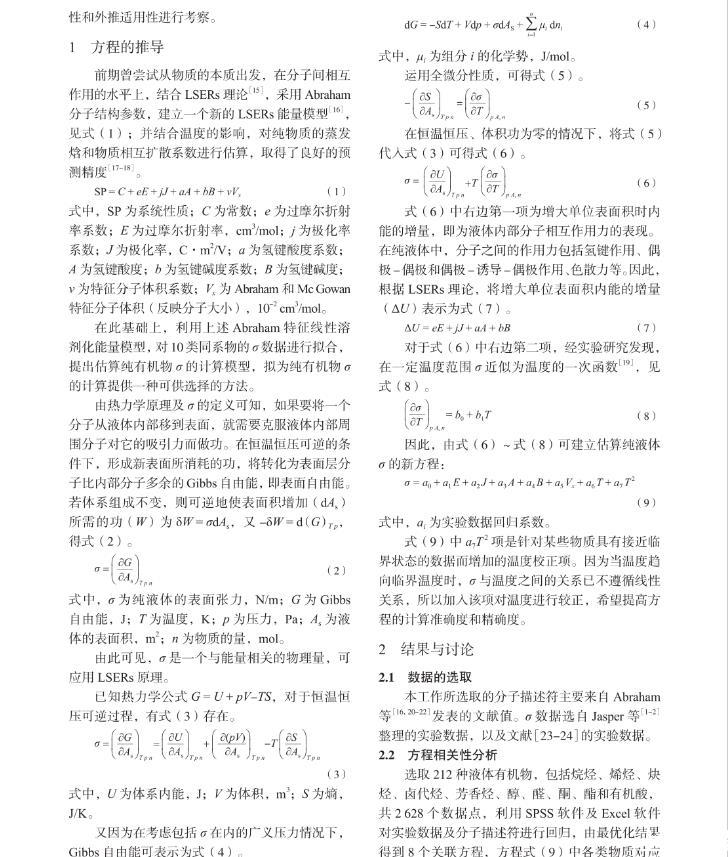 本工作提出一種將σ這一宏觀物性與微觀分子間作用力相關聯的一種新的計算方法。根據線性溶劑化能量關係(LSERs)理論和經驗方程,提出了在不同溫度下估算純有機物σ的關聯式。利用所得關聯式對2 628個純組分體係中的10個同係物進行了回歸,得到了σ的關聯方程,並對方程的相關性和外推適用性進行考察。