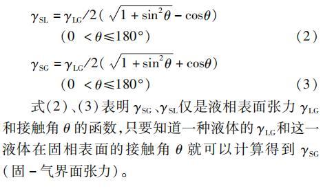 式(2)、(3)表明γSG、γSL僅是液相表麵張力γLG和接觸角θ的函數,隻要知道一種液體的γLG和這一液體在固相表麵的接觸角θ就可以計算得到γSG(固-氣界麵張力)。