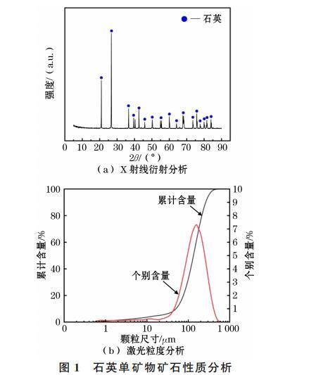 本試驗所用的單礦物石英取自某礦廠,將製備後的石英單礦物樣品進行X射線衍射(XRD)分析、X射線熒光光譜(XRF)分析和激光粒度分析,XRD的分析結果如圖1(a)所示,XRF的分析結果見表1,粒度分析如圖1(b)所示。從圖1(a)可以看出,石英單礦物SiO₂峰強度以及密度最高,說明SiO₂占主導地位。從圖1(b)可以看出,樣品的中值粒徑D₅₀達到了133.5μm,D₉₀則達到了264.3μm.綜合上述礦物的純度以及粒度,石英可滿足後續單礦物試驗以及機理分析的要求。