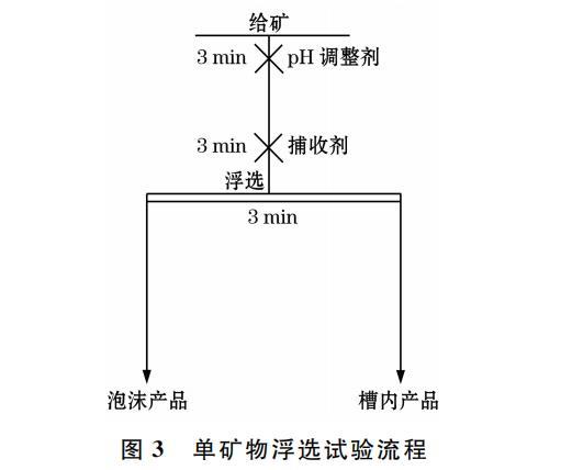 采用一次粗選的試驗流程,探究十二胺(DDA)和YTDB在不同礦漿pH、不同捕收劑用量下,對石英以及赤鐵礦回收率的影響。單礦物浮選試驗在XFD-Ⅲ浮選機進行,在室溫條件下配製礦漿,稱取2.00 g的單礦物放入浮選槽中,再加入20 g去離子水,控製浮選機的攪拌速度為1900 r/min,攪拌2 min以充分攪勻礦漿。加入事先準備好的pH調整劑調漿3 min,再加入捕收劑調漿3 min後,開始刮泡,控製刮泡時間為3 min.浮選結束後,將精礦進行過濾、烘幹、稱重,隨後計算其回收率。單礦物浮選試驗流程如圖3所示。