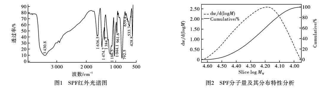 1)SPF紅外光譜分析(IR)SPF紅外光譜結果見圖1,3430.8cm⁻¹為羥基伸縮振動峰,這不可能是醇羥基,而是酚羥基。3000cm附近有一個小峰,在1474.7cm是亞甲基變形振動峰,說明SPF中含有亞甲基。1636.5cm是苯環上的C=C鍵伸縮振動產生的特征吸收峰,在指紋區中的792.5cm⁻¹區域中的譜帶是取代苯的1,2,6取代的特征吸收峰。1186.5cm⁻¹和1044.1cm⁻¹是由於S=O鍵伸縮振動產生的特征吸收峰,在700—500cm⁻¹的連續吸收峰是S—O、S—S、C—S鍵伸縮振動產生吸收峰。SPF產物的分子中含有磺酸基、羥基和亞甲基等官能團。