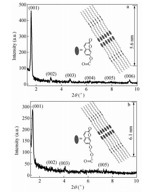 通過垂直沉積法在35mN/m的膜壓下,將氣-液界麵上的單層膜轉移到石英片上,製備CODA和CO2DA多層LB膜。81層CODA和CO2DA LB膜的小角X射線衍射圖如圖3所示。