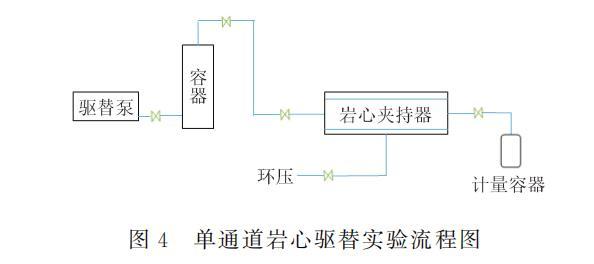 將3塊岩心抽真空後,飽和原油,根據飽和油的體積計算岩心孔隙度;將飽和好油的岩心在地層溫度下恒溫放置48h;使用標準鹽水進行水驅油,采出液含水率達到98%以上時停止,然後在地層溫度(30℃)下分別使用配製的CAO、CCAO和FHQ-I繼續以0.5PV的體積驅油,接著水驅直至含水率達到98%,計算出油體積,記錄驅替過程中壓力變化及采出液中的含油量,計算各階段采收率,結果見表6,驅替實驗流程如圖4所示。