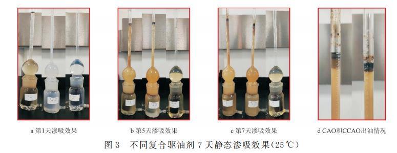將岩心在110℃下烘幹,稱重;將飽和好油的岩心置於阿莫特密封瓶(Amott cell瓶)中,分別加入試樣溶液(CAO、CCAO或FHQ-I的標準溶液)至略超過Amott cell瓶的最低刻度處,在25℃環境中,觀察並記錄其出油體積,通過計算得到的結果見表5,同時觀察不同時間飽和岩心滲吸出的原油形態(如圖3所示)。