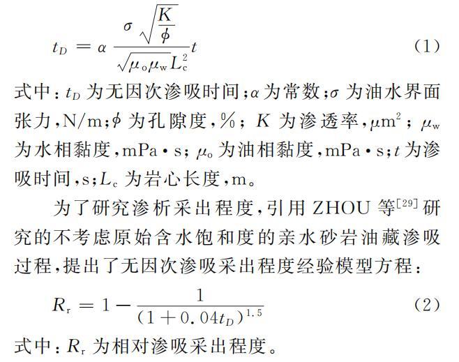 為研究黏度及界麵張力對滲析采出程度的影響,引用MA等推導出的公式(1),式中同時考慮了親水係統和滲吸親油係統的無因次滲吸時間。