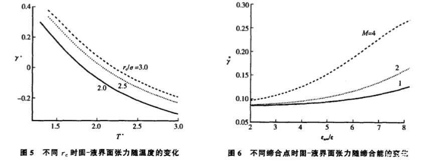 圖 5 表明界麵張力隨溫度的升高而降低。然而,在某一溫度下,界麵張力卻因選取 rc 的不同而有較大區別:rc 越大,所對應的界麵張力越大。這種變化趨 勢歸因於截斷半徑對分子間色散力作用效果的影響,即隨著 rc 的變大,分子間因色散吸引而發生相互關聯的範 圍也變大,最終導致界麵張力的變大。為進一步理解分子間相互作用對界麵張力的影響,圖 6 給出了界麵張力隨締合強度的變化,並對比了不同締合點數目情況下體係的界麵張力。結果表明:界麵張力隨 ε 的變大而增加,且單體分子上締合點越多,界麵張力越大。這是因為 ε 越大,界麵區域內 的分子受到的臨域中其他分子的締合作用越強,且該締合作用指向體係內部,從而導致界麵張力的變大。與此同時,若分子上締合點數目越多,界麵區域的分子能夠與臨域分子發生締合的機會越大,這也在一定程度上增大了體係的界麵張力。