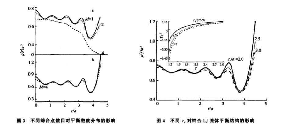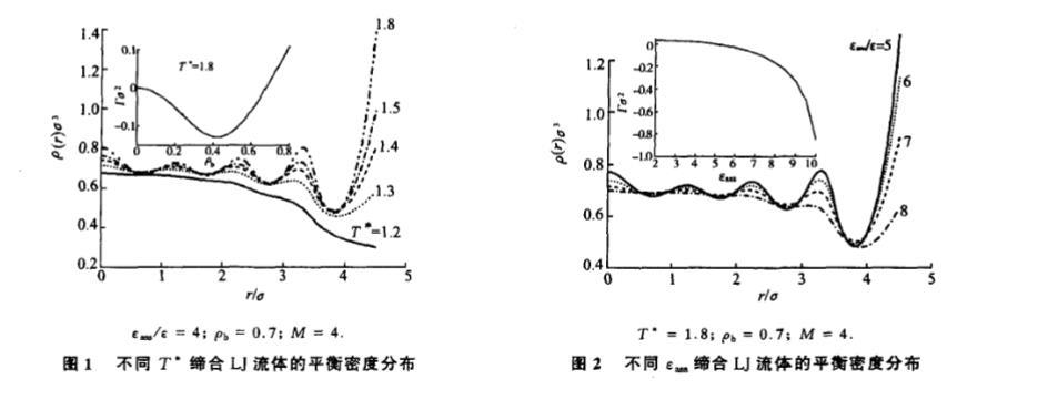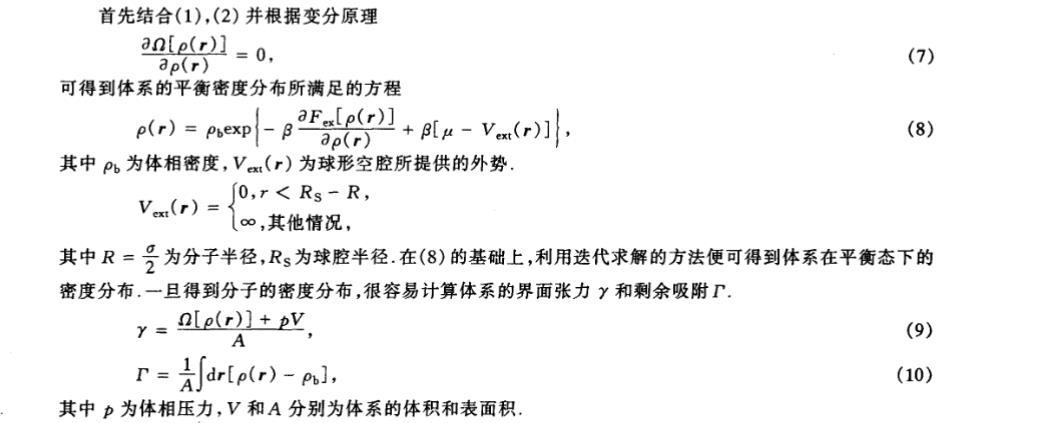 其中 R=σ/2 為分子半徑,Rs 為球腔半徑。在 (8) 的基礎上,利用迭代求解的方法便可得到體係在平衡態下的密度分布。一旦得到分子 的密度分布,很容易計算體係的界麵張力 γ 和剩餘吸附 Γ。