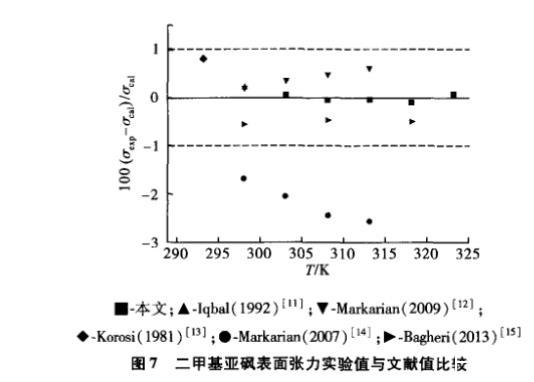 圖7 二甲基亞碸表麵張力實驗值擬合得到的方程與文獻實驗值的偏差