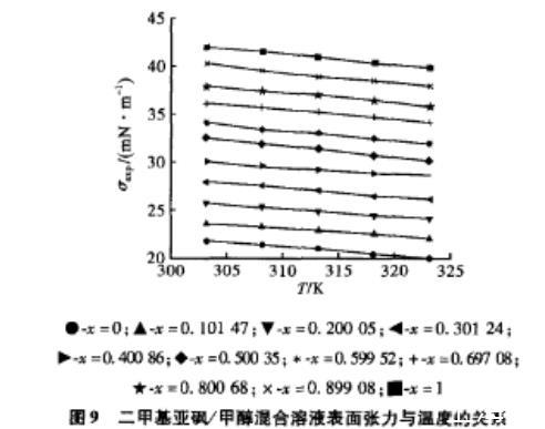 圖9 二甲基亞碸/甲醇混合溶液表麵張力與溫度的關係