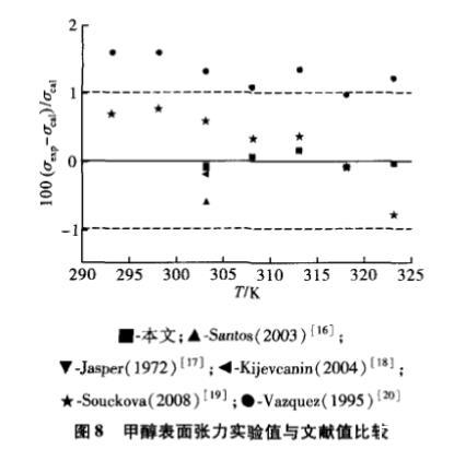 圖8為甲醇表麵張力實驗值擬合得到的方程與文獻實驗值的偏差,本文數據與Santos等[15],Jasper[16],Kijevcanin等[17]和Souckova等[18]數據吻合得較好,與Vazquez等[19]數據偏差稍大,最大偏差為1.6%。
