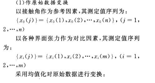 灰色關聯分析是通過對統計序列幾何關係的比較來分清係統中多因素間的關聯程度,序列曲線的幾何形態越接近,則它們之間的關聯度越大。油水、水固、油固界麵張力對接觸角影響程度的灰色關聯分析步驟如下。