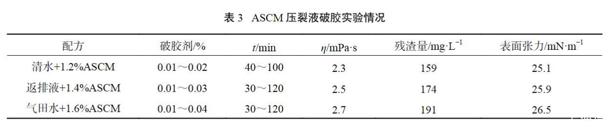 分別采用清水、氣田水配製壓裂液,參考SY/T 7627—2021《水基壓裂液技術要求》中的方法評價耐溫耐剪切性能,實驗條件為:剪切速率170 s?1,初始溫度30℃,升溫速度3℃/min,升溫至120℃後,恒溫剪切90 min。結果顯示,1.4%的ASCM在清水中的初始黏度在140 mPa·s左右,在120℃下剪切後黏度在60 mPa·s以上;1.6%的ASCM在氣田水中初始黏度為135 mPa·s,在120℃下剪切後黏度保持在50 mPa·s左右;ASCM具有良好的耐溫耐剪性能,在清水和氣田水中配製的壓裂液的流變性能都能滿足施工需求。