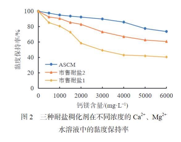 模擬蘇裏格氣田水中Ca2+、Mg2+含量,配製鈣鎂總量在500~6000 mg/L的二價鹽水溶液,分別評價ASCM和兩種市售耐鹽稠化劑的耐鈣鎂離子的能力,結果如圖2所示。ASCM耐鈣鎂離子的能力明顯優於另外兩種耐鹽稠化劑,當鈣鎂總量達到3000 mg/L時黏度保持率在90%左右,鈣鎂總量達到6000 mg/L時黏度保持率在70%以上,耐鈣鎂能力達到6000 mg/L。這是由於ASCM結構中的雙尾疏水單體在微疏水作用下賦予聚合物分子鏈良好的延展性和柔韌性,促使聚合物在高鹽水中快速舒展溶脹,同時含有的季銨鹽陽離子、磺酸基團能夠有效減弱高濃度Ca2+、Mg2+對聚合物的屏蔽作用,有利於形成更多的氫鍵結構,在分子鏈間提供更多的物理“交聯位點”,保持較大的流體力學體積,提高在鹽水中的增黏效果。