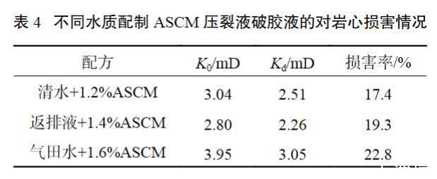 表4不同水質配製ASCM壓裂液破膠液的對岩心損害情況