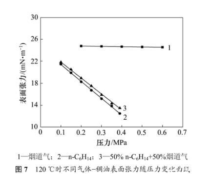 圖7對比了120℃時煙道氣、正己烷和煙道氣+正己烷3種氣體與稠油的表麵張力變化規律。由圖7可見:當溫度一定時,3種氣體-稠油表麵張力均隨壓力的增大而減小,但是變化的幅度不同;在低壓下,煙道氣對降低稠油表麵張力作用有限,當氣體中含有正己烷時,稠油的表麵張力明顯降低;在120℃和0.3 MPa時,煙道氣-稠油表麵張力為24.70mN/m,向煙道氣中加入50%(摩爾分數)的正己烷後表麵張力為15.89mN/m,與純正己烷氣體表麵張力相差不大,後者為 15.19 mN/m。前麵的研究表明,煙道氣-稠油表麵張力可以由 CO2-稠油表麵張力和 N2-稠油表麵張力線性疊加得到,但是對於煙道氣+正己烷混合氣體,正己烷對降低表麵張力起主要作用,不能簡單的由煙道氣-稠油表麵張力和正己烷-稠油表麵張力進行簡單的線性插值進行計算。