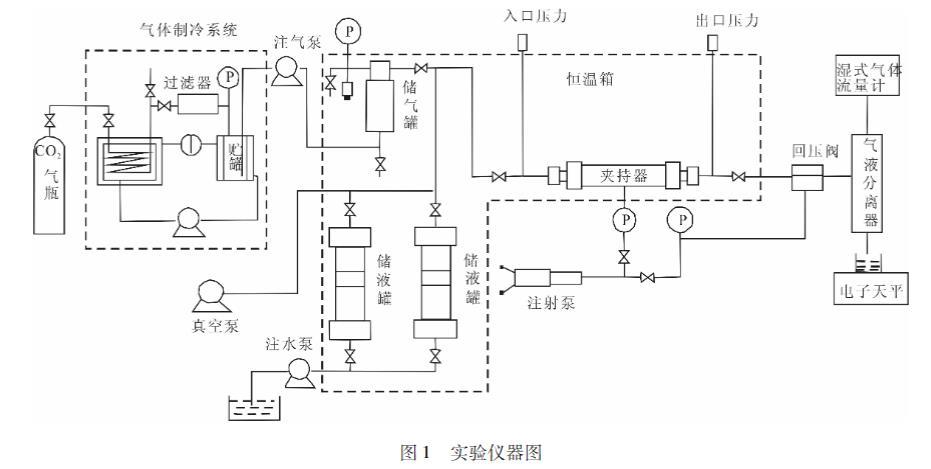 實驗所用裝置為地質封存條件下CO2遷移物模擬平台,如圖1所示。主要結構分為以下幾個係統:氣體製冷係統、氣體注入驅替係統、液入驅替係統、回環壓係統、岩心夾持係統、量係統、抽真空係統及數據采集和微機測控係統等。CO2氣體經氣體製冷係統冷卻後通過注氣壓注入儲氣罐,最大注入壓力20MPa。液體現,通過注水泵恒流注入儲液罐,最大注入流量為9.9ml/min。通過注射泵設置回、環壓。儲氣罐和儲液罐通過出氣、出液閥門將CO2、液體括注入岩心夾持器。通過真空泵對岩心抽真空。口端的氣體、液體通過氣液分離器分離,氣體通過濕式氣體流量計記錄瞬時和累計流量,體通過電子天平稱重的方式記錄其瞬時和累g計流量。瞬時的入口、出口壓力通過計算機記秦玉錄。儲氣罐、儲液罐、岩心夾持器都放置於恒溫況箱內,通過恒溫箱控製其內部溫度,範圍為室溫至120℃。