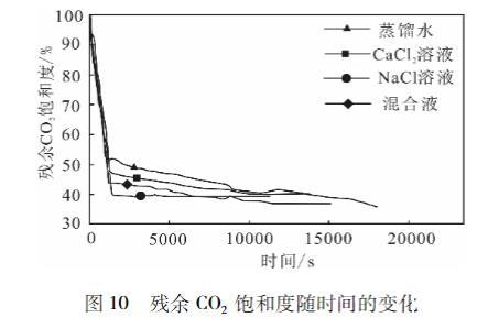 活塞式驅替階段:驅替液突破岩心前,驅替過對岩心中CO2的推擠,將岩心中大部分不受毛細力控製的CO2氣體排出,驅替出的CO2氣量大,殘餘CO2飽和度隨時間迅速減小。攜帶驅替階段:驅替液突破岩心後,岩心中的大部O2氣體已被驅出,驅替液隻能裹挾出受毛細製較弱的部分氣體和殘留的小部分自由氣體,所以從岩心中驅替出的CO2迅速減少,殘餘CO2飽和度隨時間減小的速率也大大降低,隨著岩心CO2氣體不斷減少,殘餘CO2飽和度最終趨於定。不同溶液驅替條件下殘餘CO2飽和度趨於的速率由大到小依次為:10%CaCl2溶液、%NaCl溶液、蒸餾水。第二階段對最終的殘餘CO2飽和度貢獻很小。本實驗所使用的是飽和了CO2的驅替液,所以不存在Li等實驗中的殘餘飽和度曲線的溶解式驅替階段。